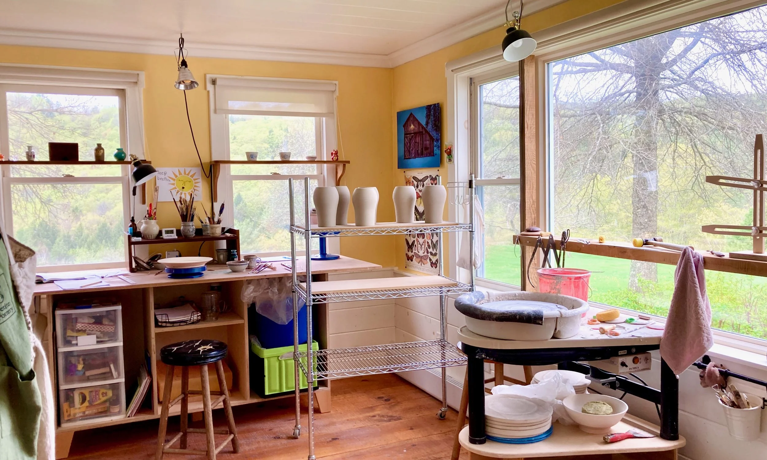 Petite Pottery Studio is housed in the original house on top of the hill on Jess’s property in Tunbridge. This inviting space is, in fact, petite, and painted a warm golden yellow and spreads the light even in the cool light of winter. The wheel faces picture windows overlooking rolling fields and forests beyond that exemplify each of the four seasons. You’ll feel like you are on a creative retreat surrounded by the nature of Vermont.